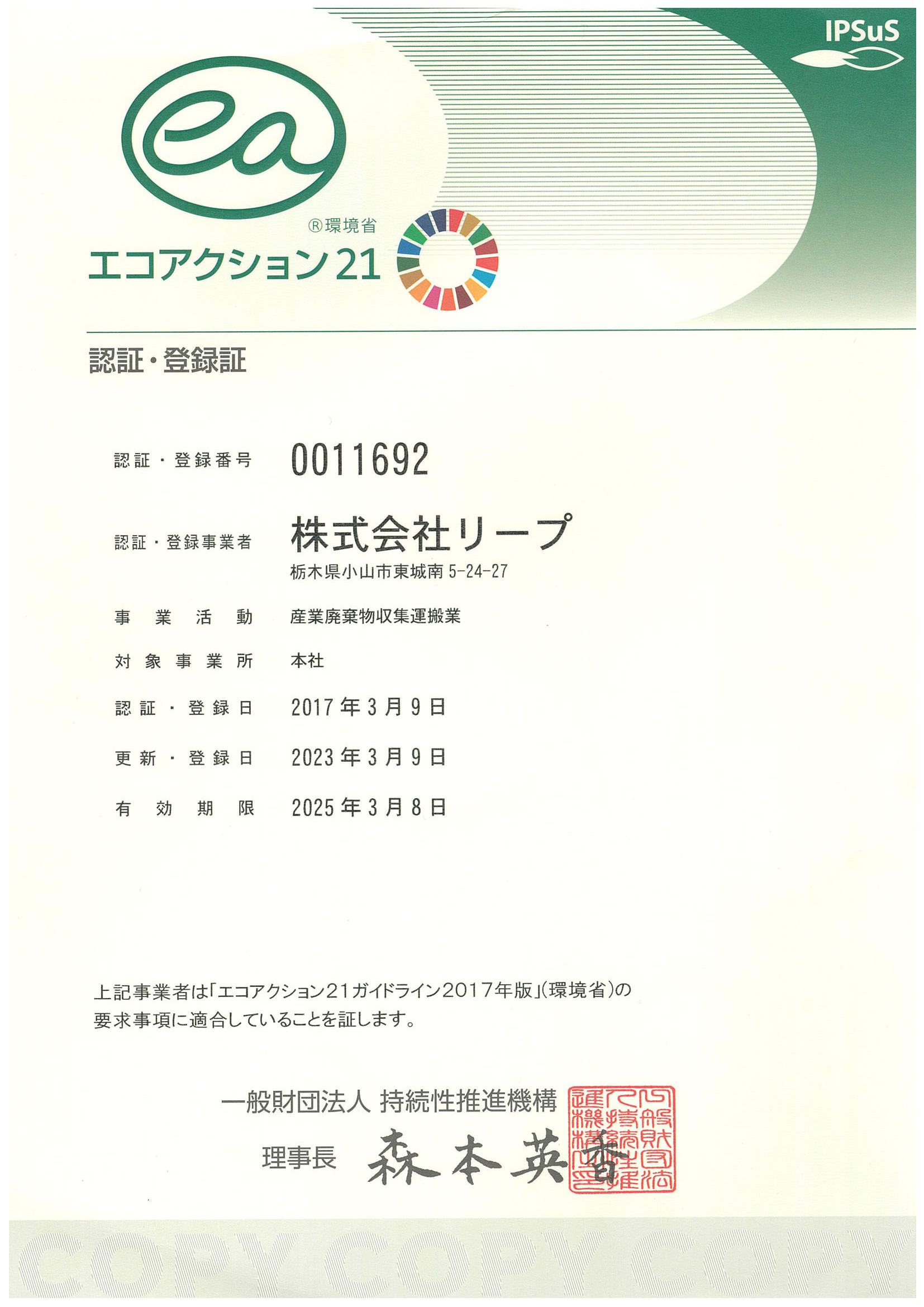 | 平成29年3月 | エコアクション21 認証 |
